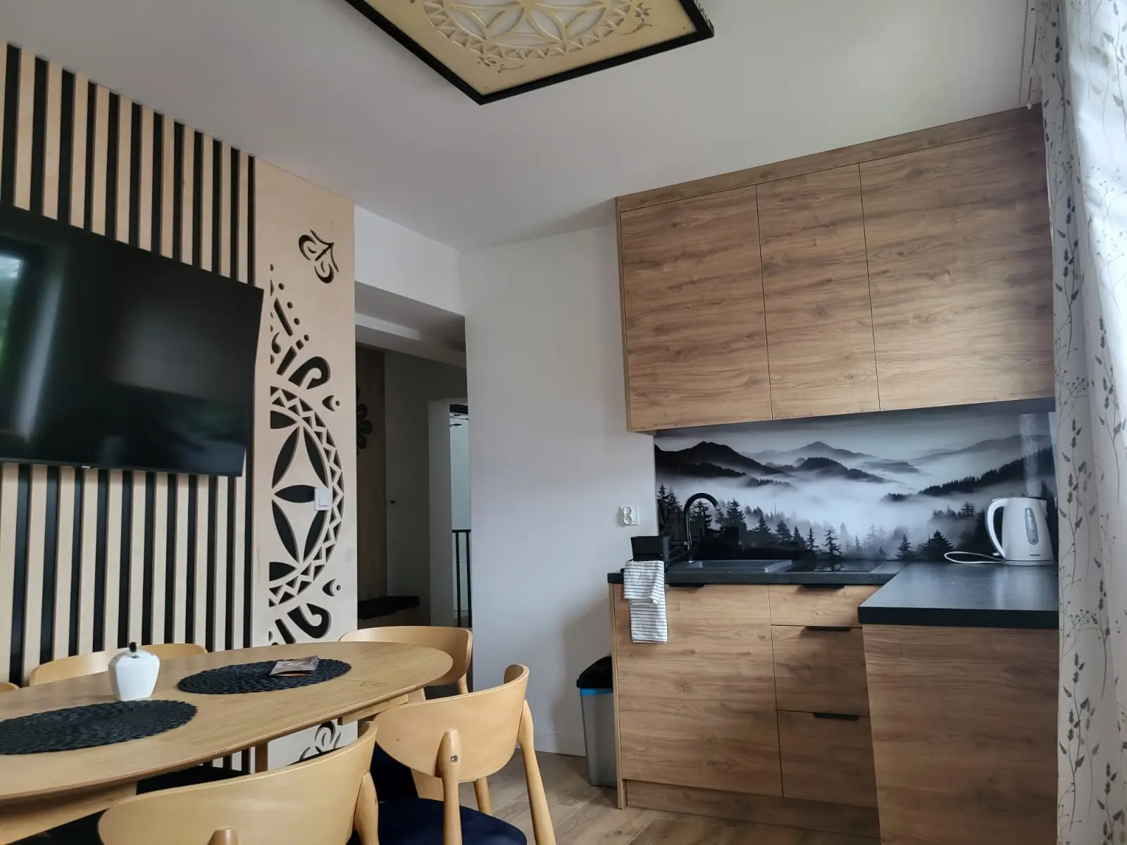 Każdy apartament oferuje w pełni wyposażoną kuchnię, nowoczesne wnętrze i funkcjonalne udogodnienia. Dzięki temu świetnie sprawdzi się zarówno na krótki weekend, jak i dłuższy pobyt w Tatrach.