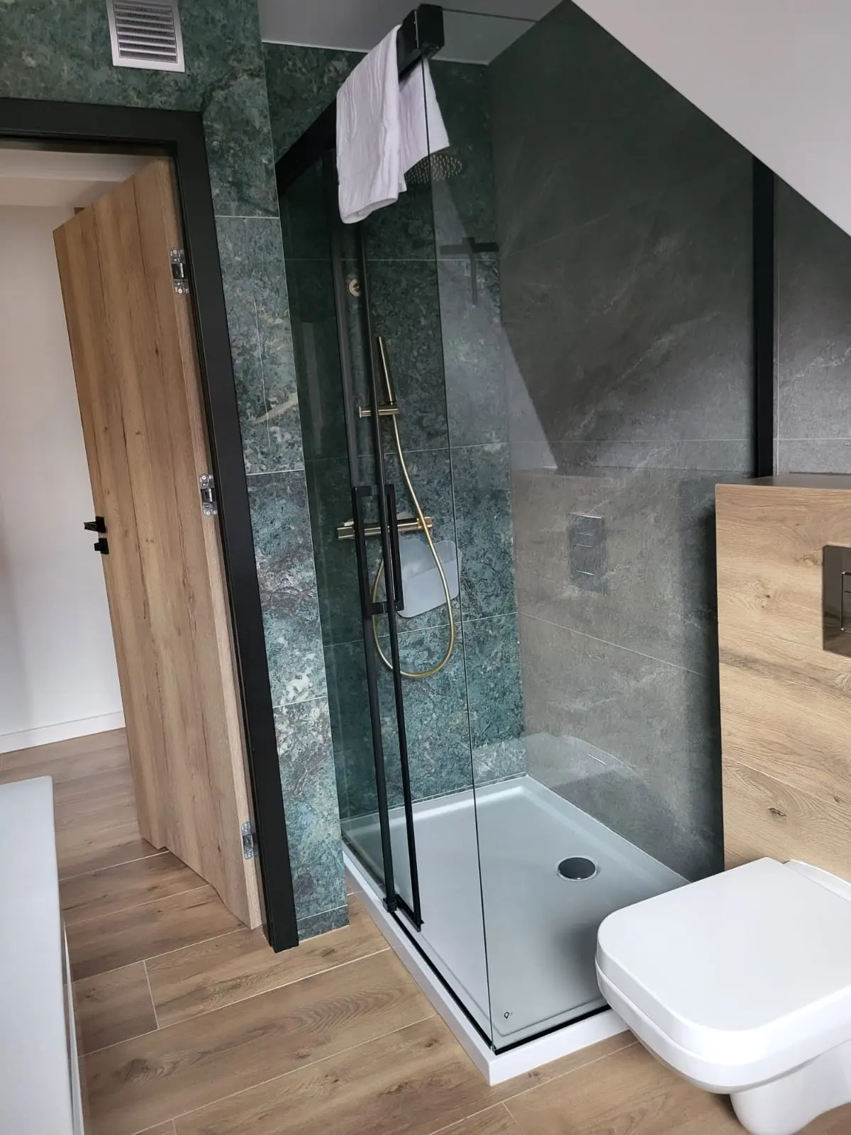 Prysznic, toaleta, umywalka, ręczniki oraz suszarka.